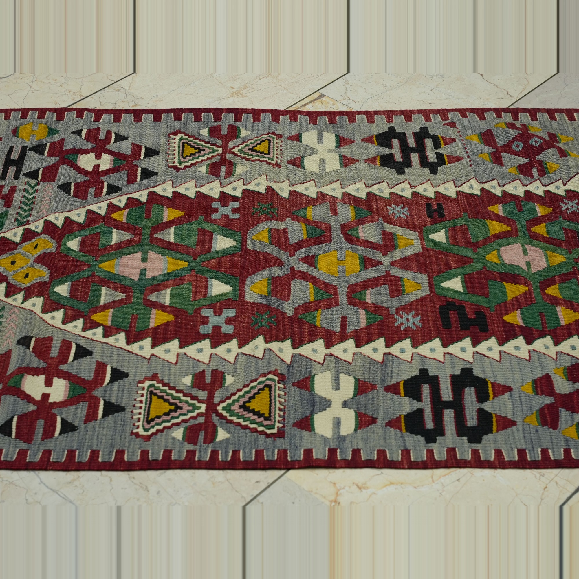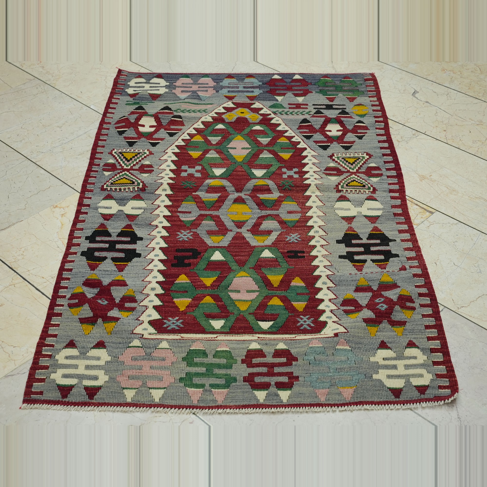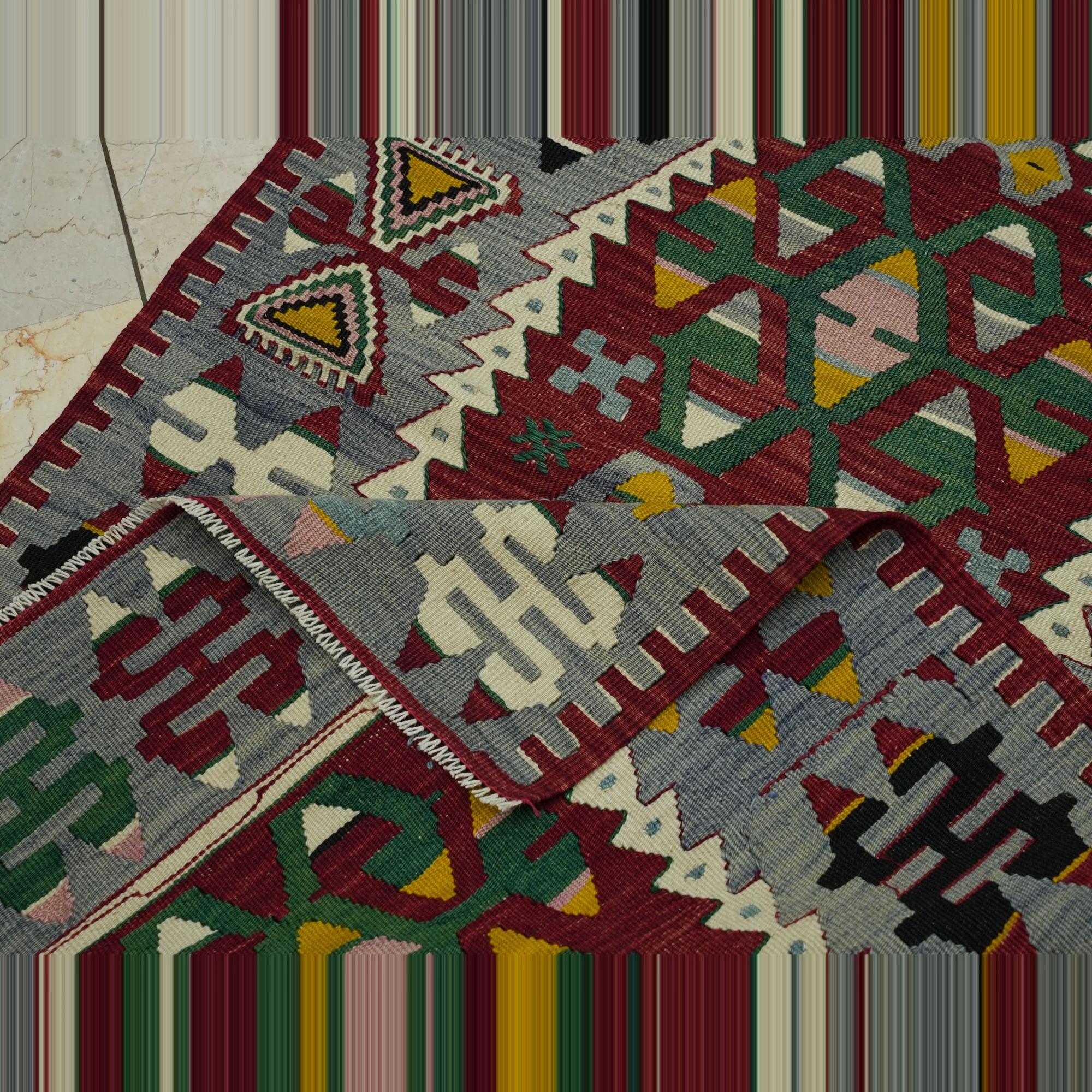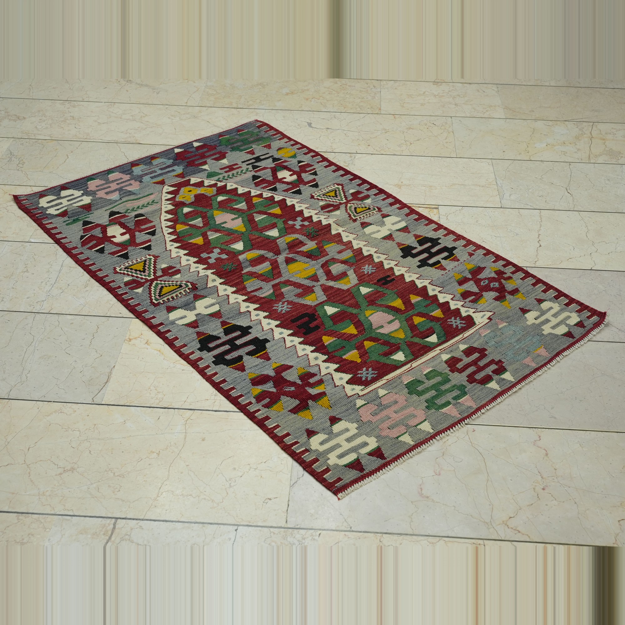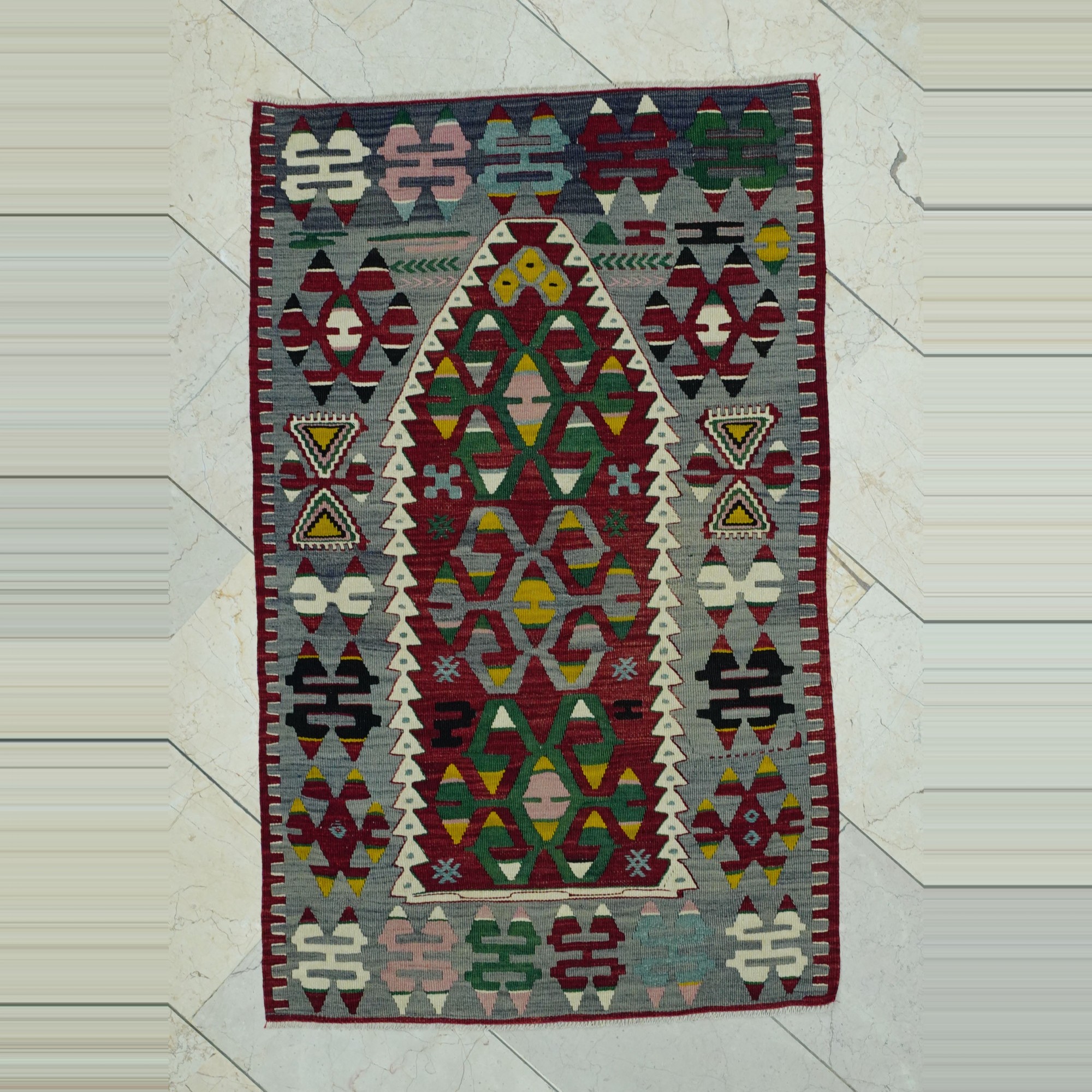 This flat-weave kilim orginating in Manisa Esme, Turkey is from the 1950s. The condition of this kilim is excellent and would provide a beautiful pop of color to any interior space.