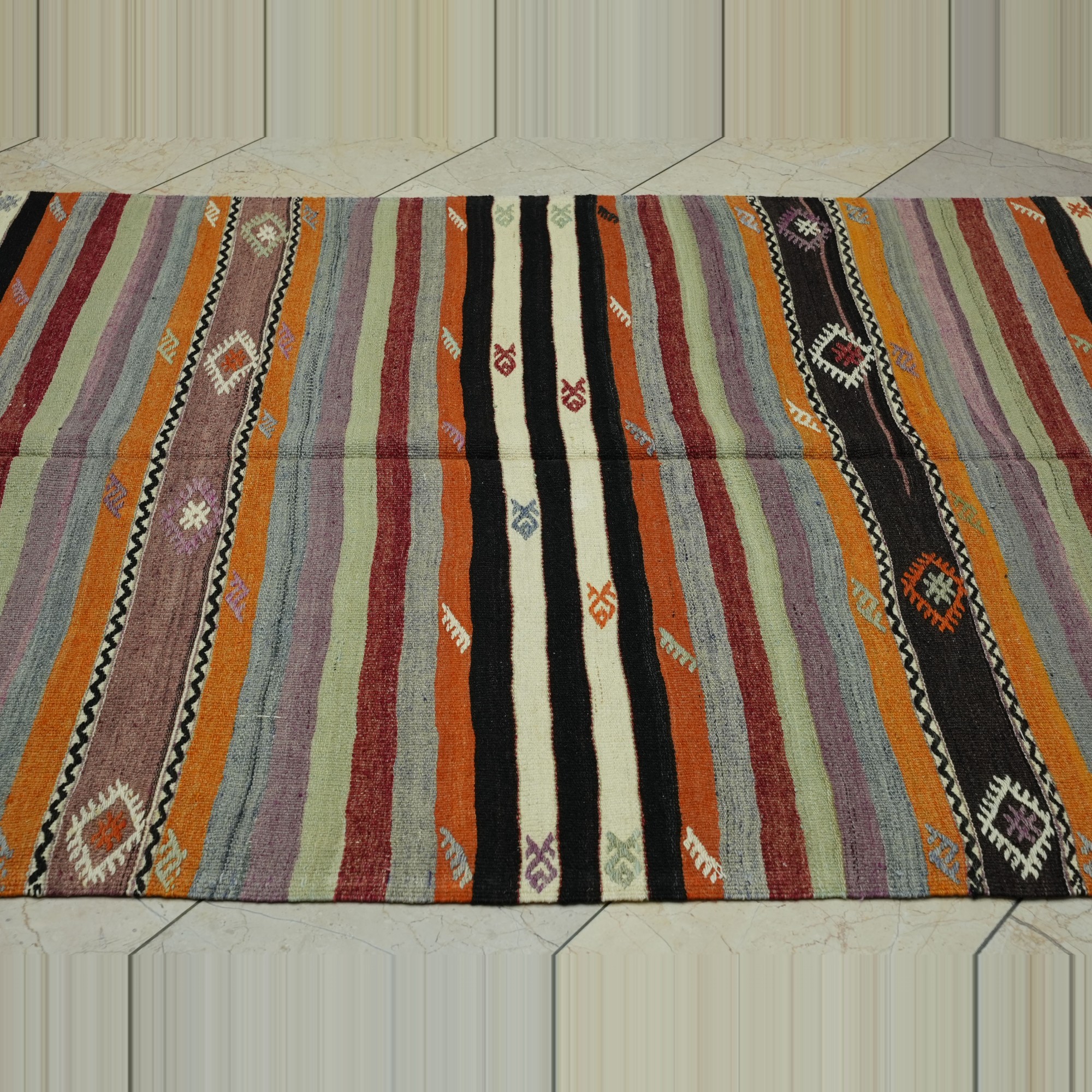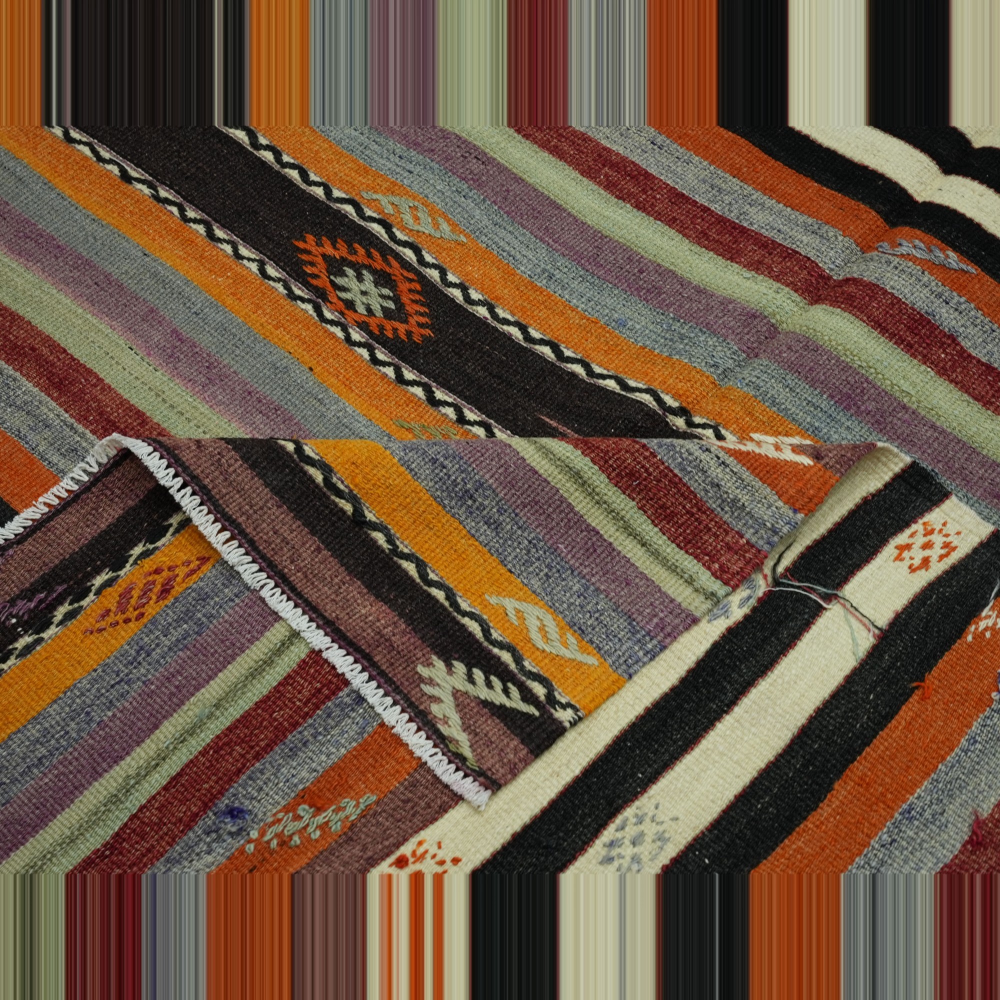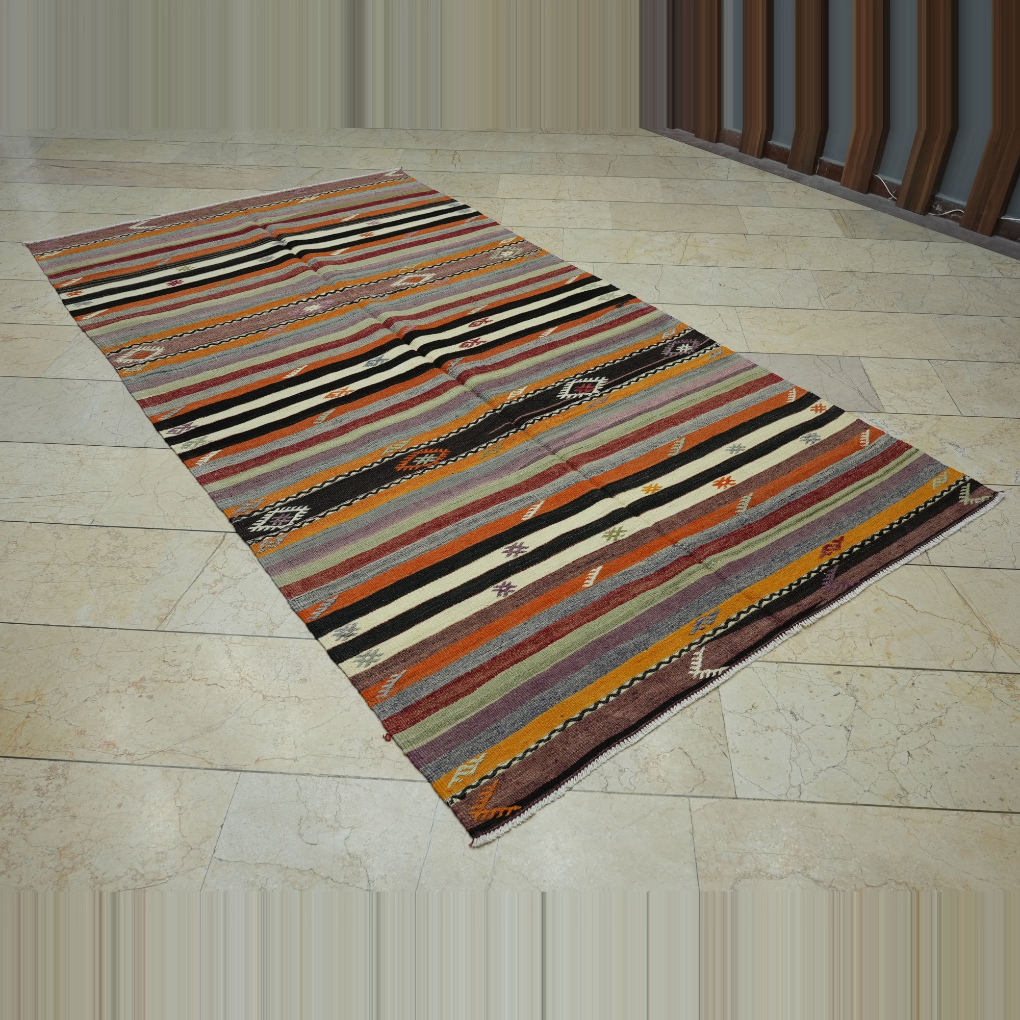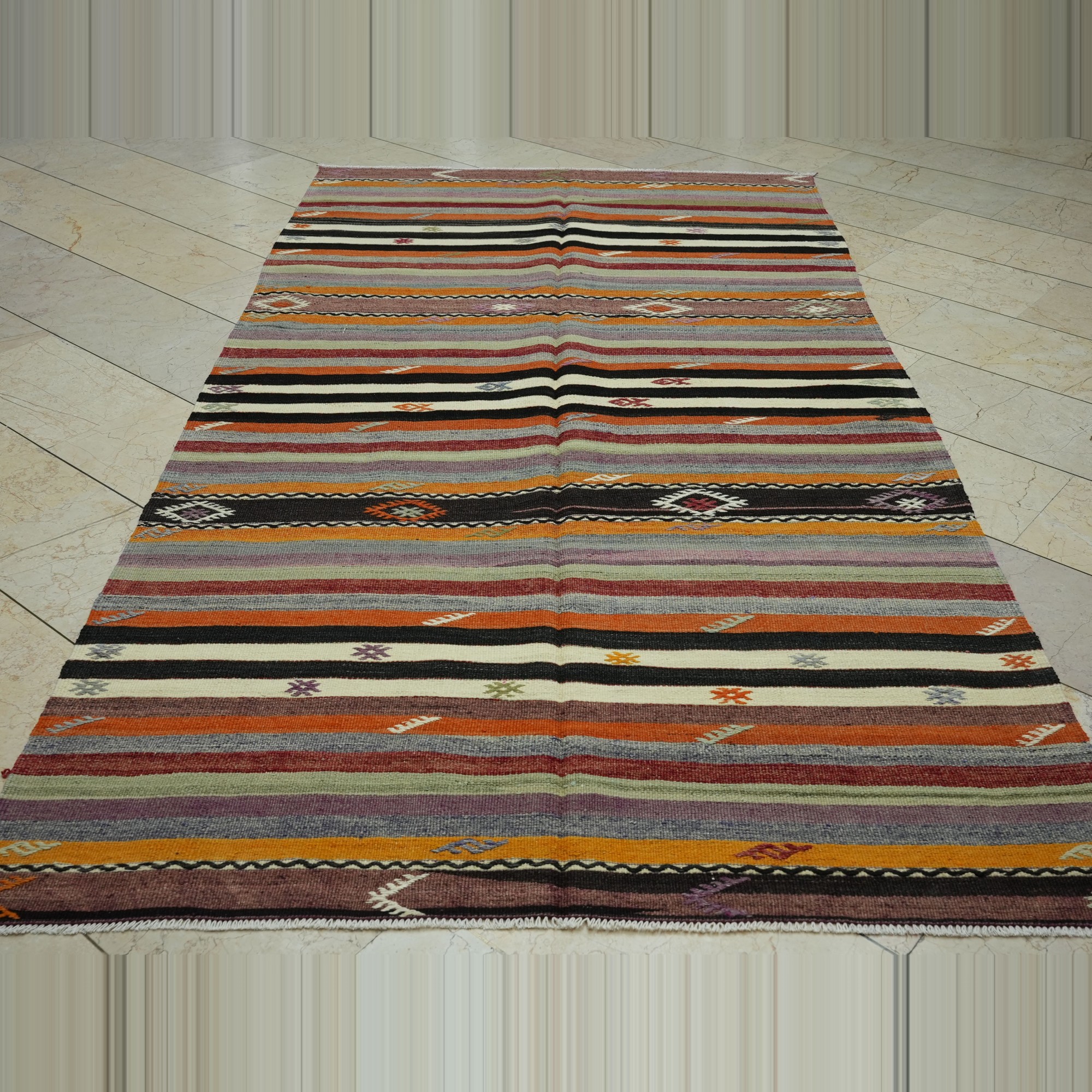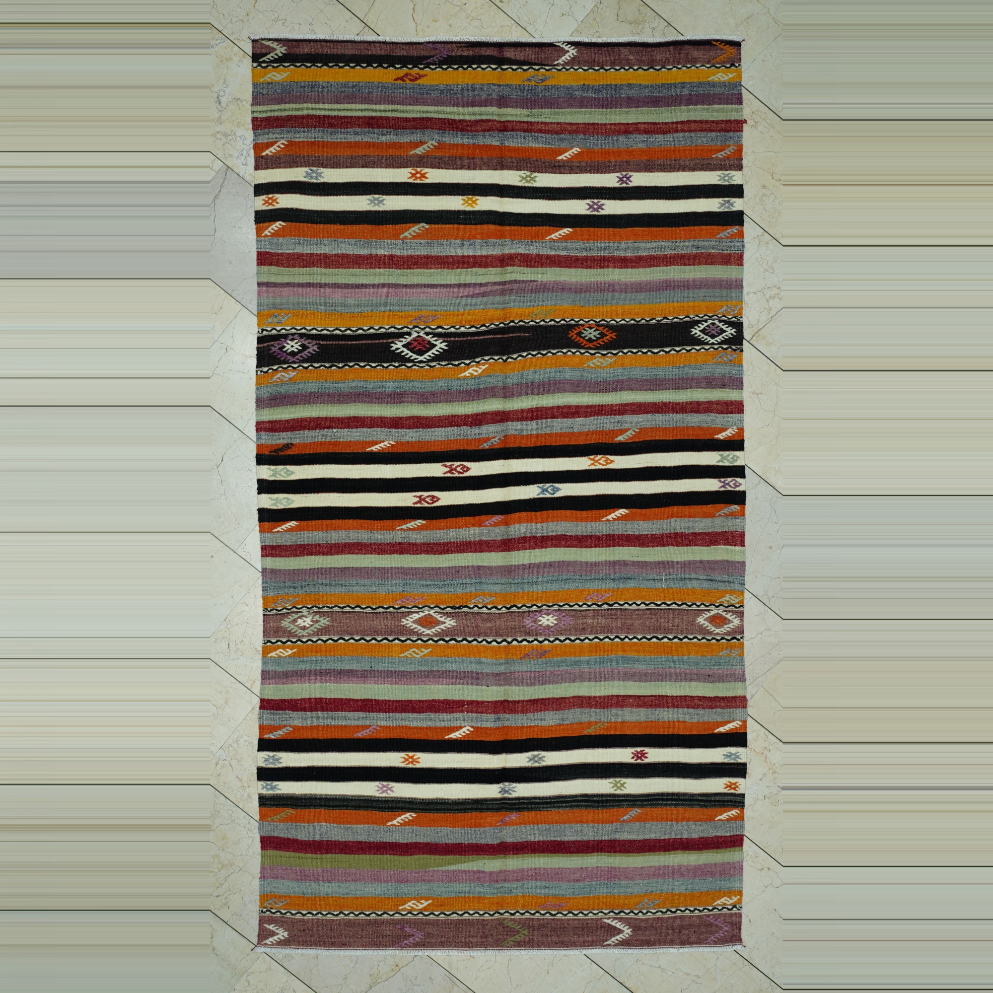 This flat-weave kilim orginating in Denizli, Turkey is from the 1960s. The condition of this kilim is excellent and would provide a beautiful pop of color to any interior space.