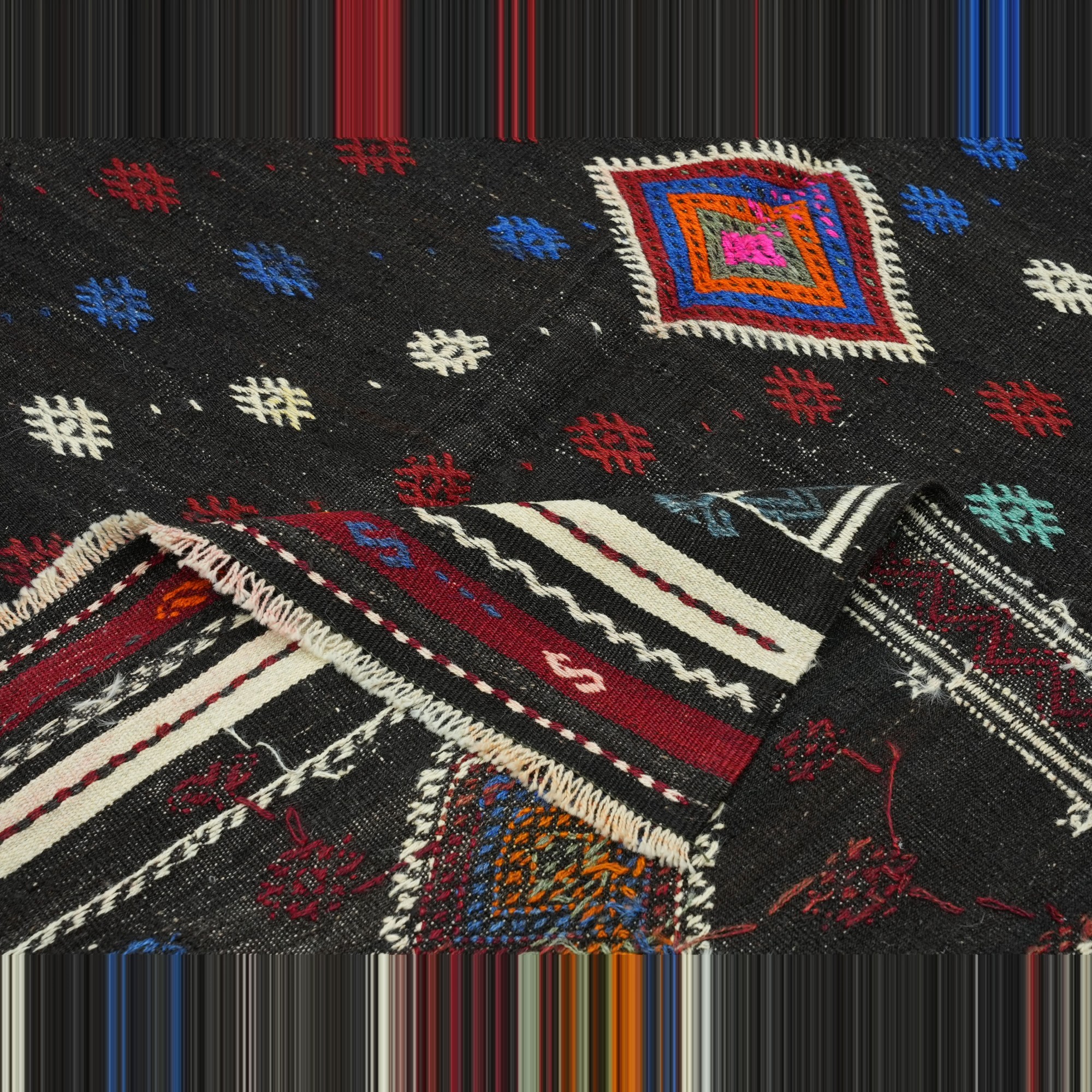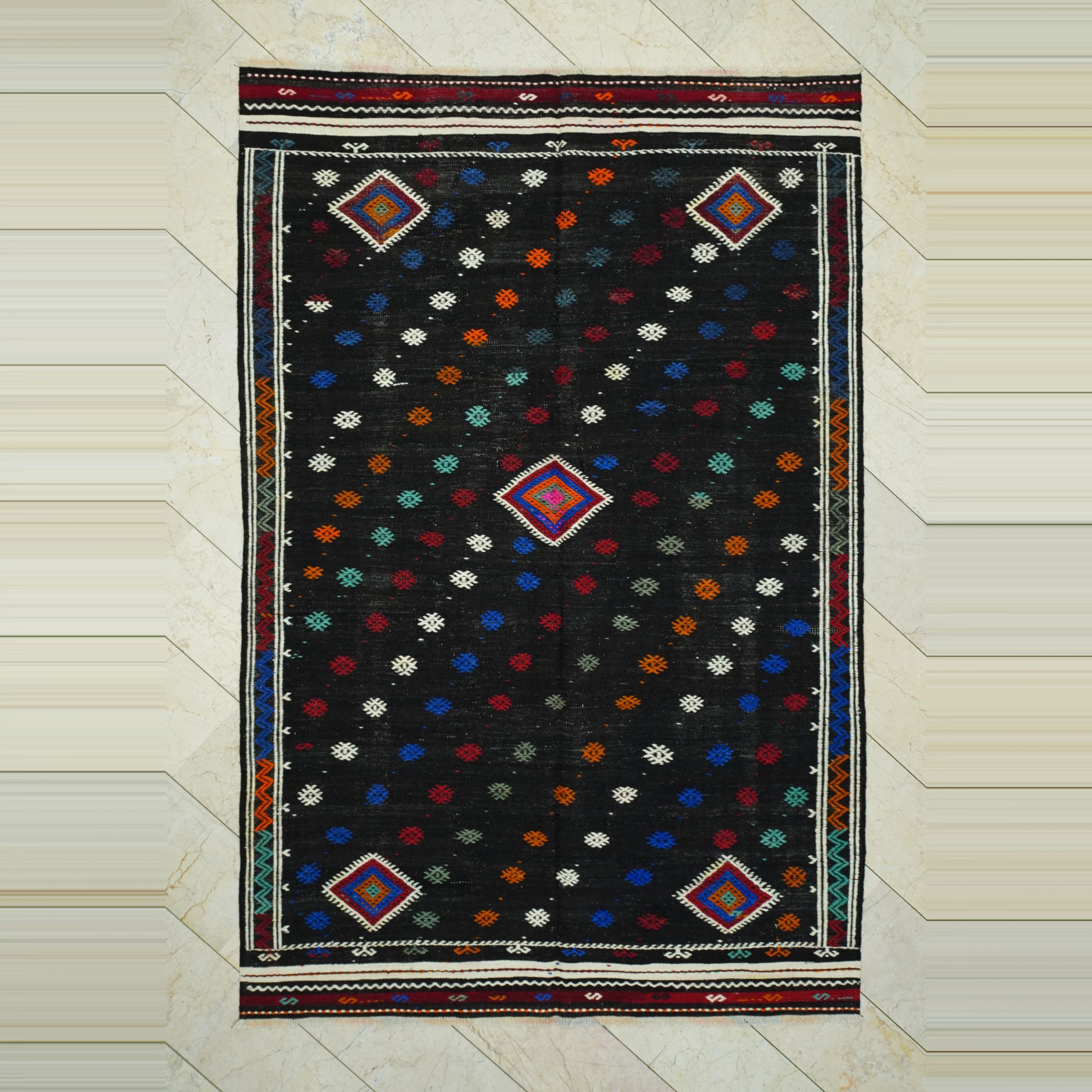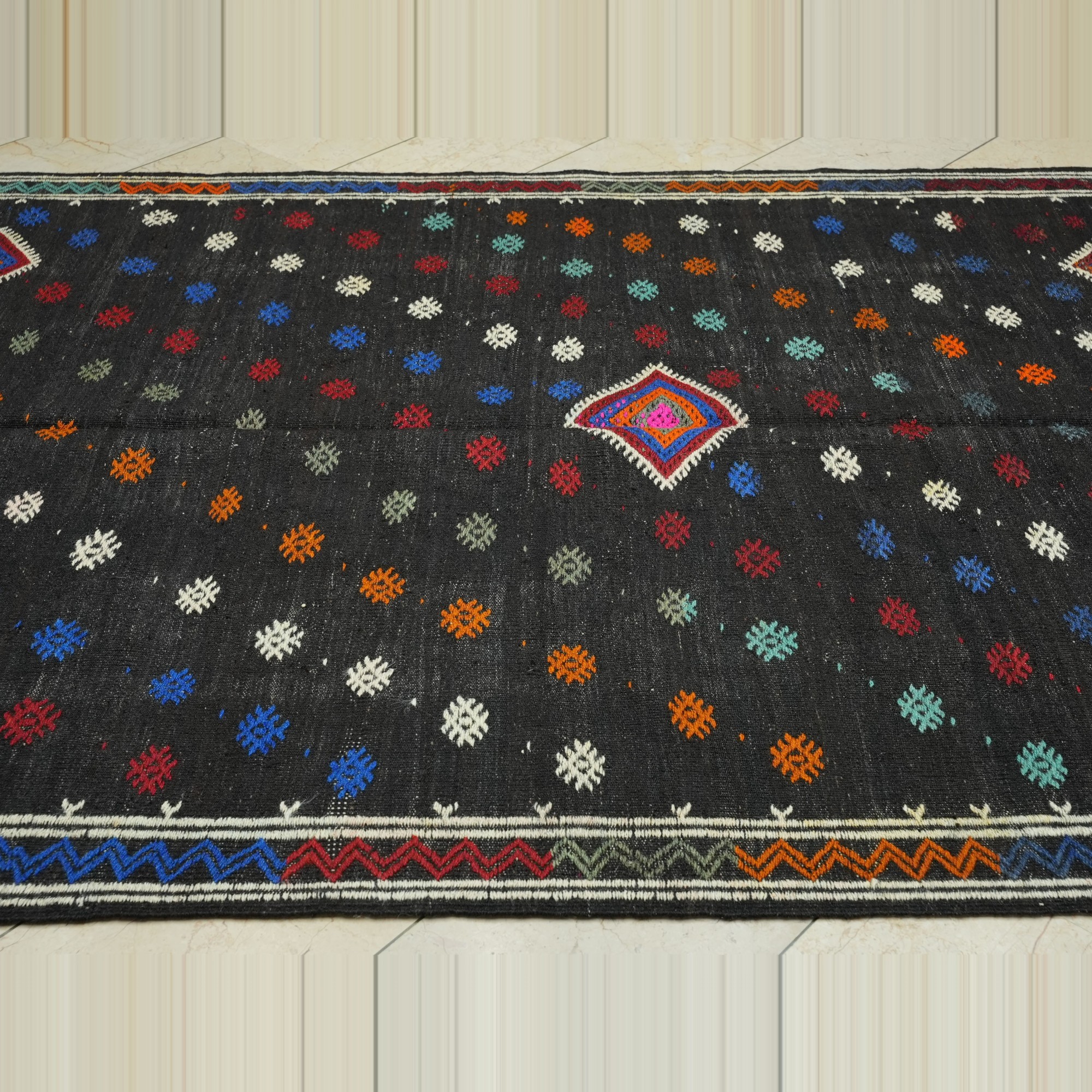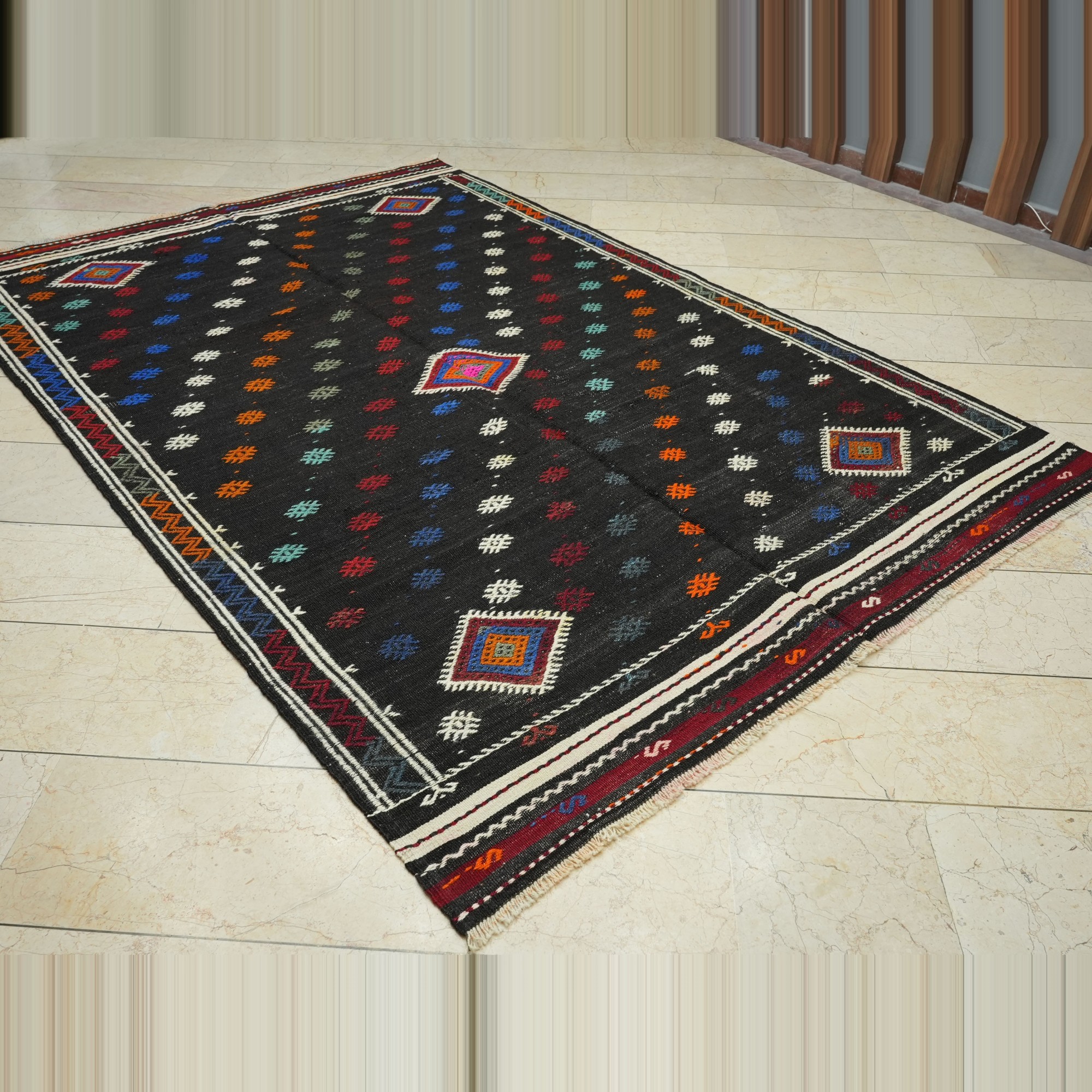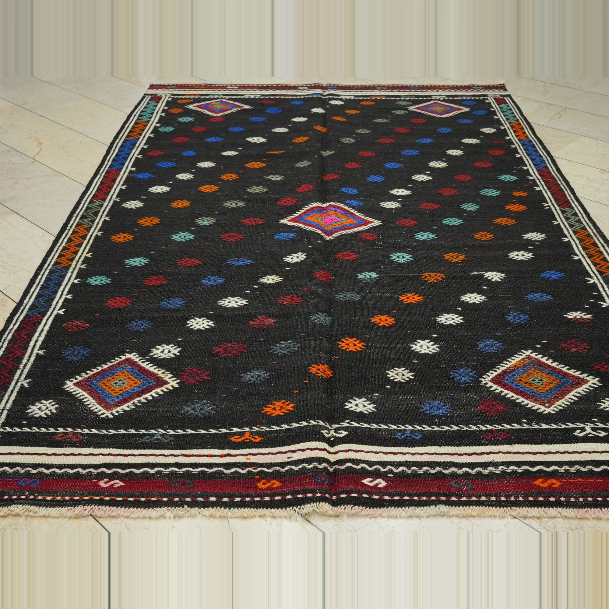 6x9.5 Embroidered Black Goat Hair Kilim Rug