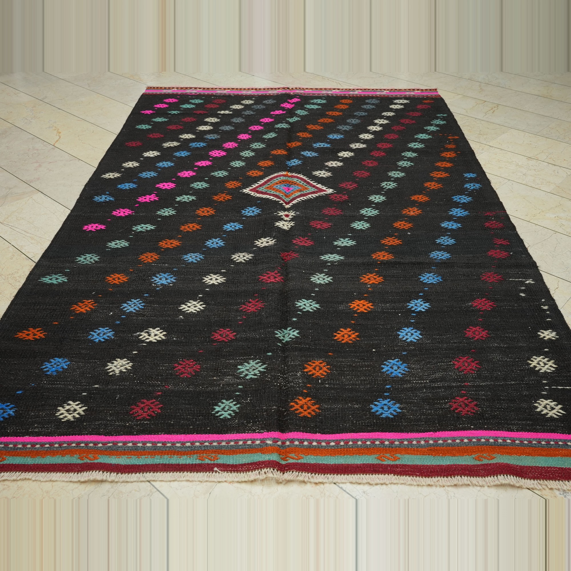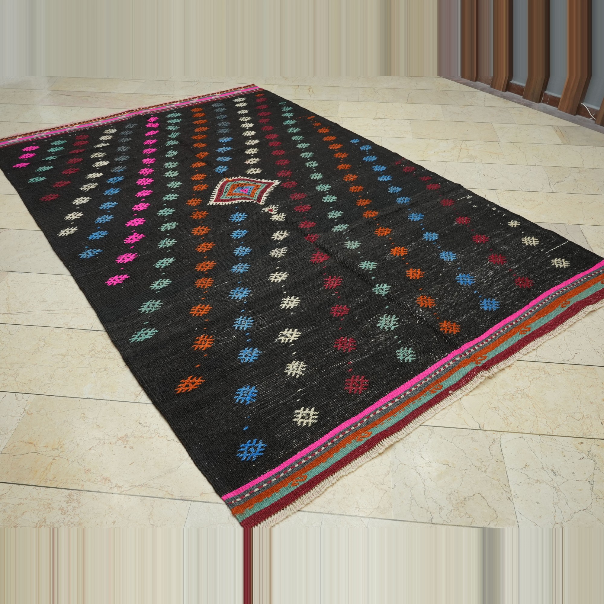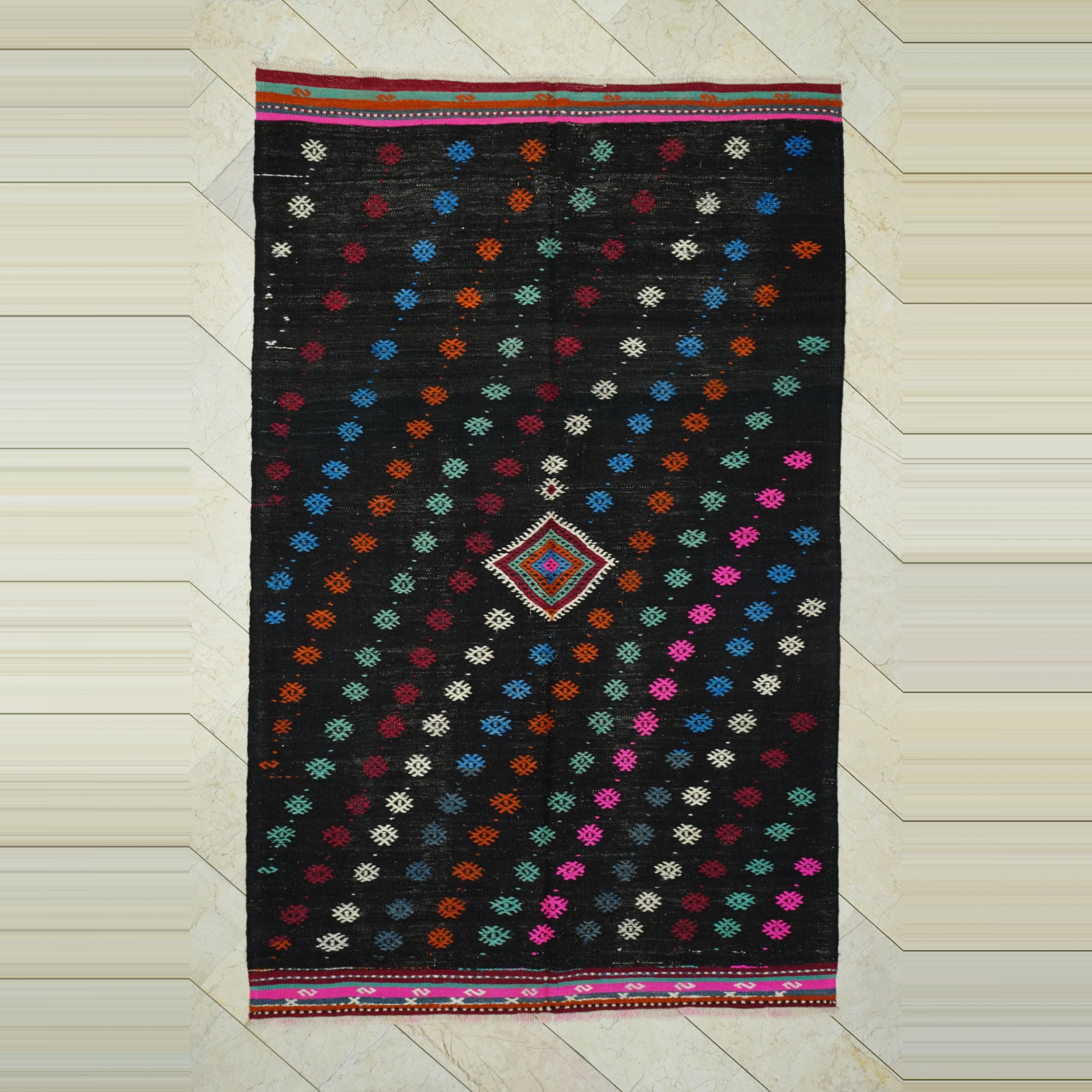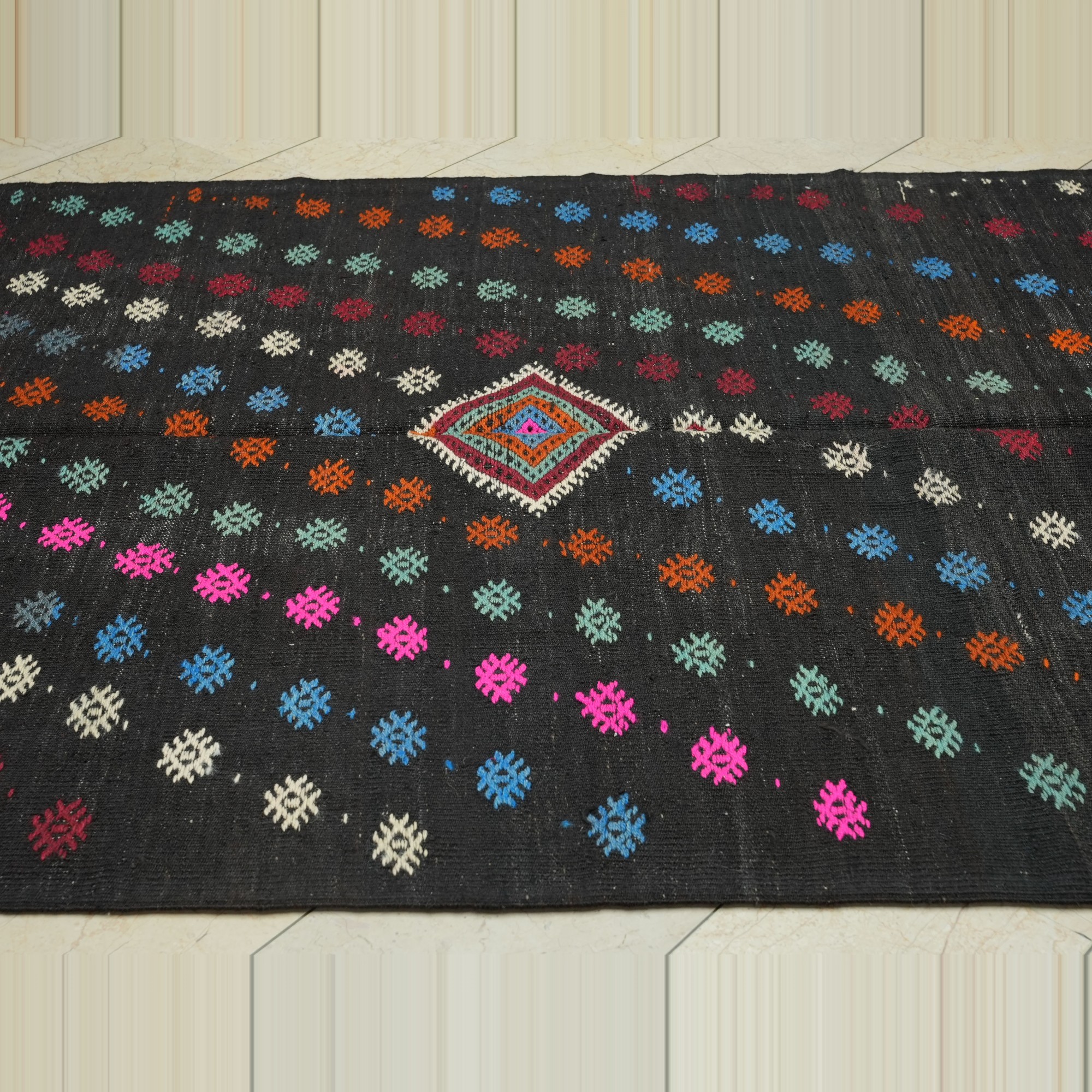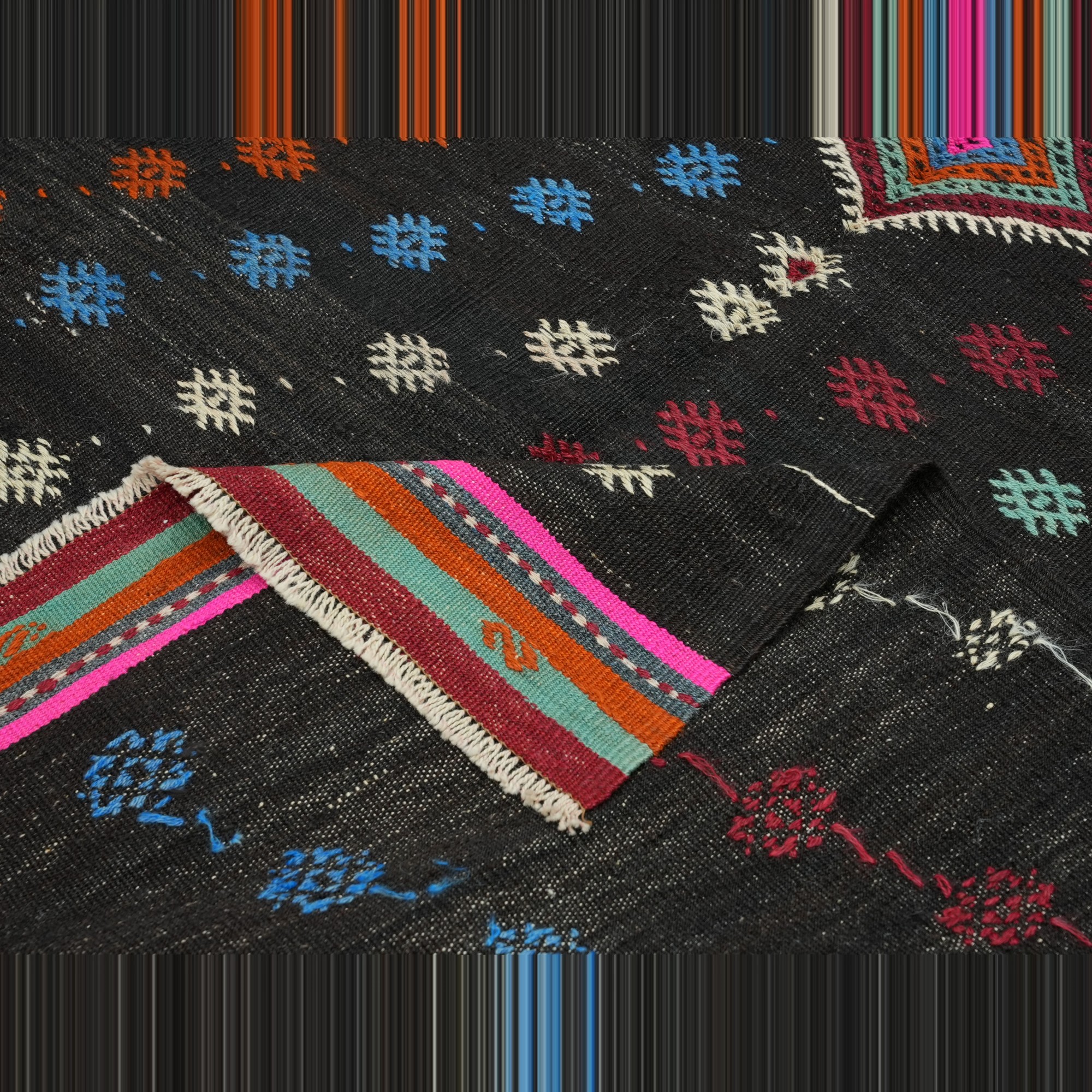 6x9.5 Embroidered Black Goat Hair Kilim Rug